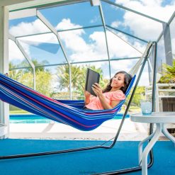 L’amaca in borsa è un’amaca versatile in stile brasiliano a grandezza naturale. realizzato in una miscela di poliestere traspirante e tessuti di cotone riciclato ecologici. è l’amaca con estremità raccolte più comoda, realizzata per fornire maggiore comfort nelle aree comunemente sottoposte a tensione come la testa, le ginocchia e le caviglie. le estremità dell’anello sono rinforzate in acciaio e possono essere utilizzate sia all’interno che all’esterno con grande durata. tutto l’hardware per appendere è incluso: (2) viti ad occhiello e (2) ganci che lo rendono facile da appendere tra gli alberi o da un soffitto interno e può essere appeso come un letto o una sedia amaca. la capacità di peso complessiva di questa amaca è di 220 libbre. e viene fornito con una garanzia di un anno…trova la tua felicità