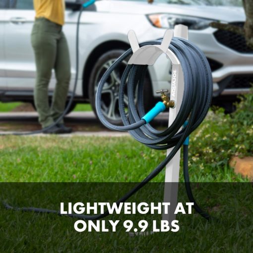 dì addio ai tubi pesanti e aggrovigliati e riponi il tubo in modo più ordinato con il rubinetto porta tubo da giardino in acciaio di aqua joe.