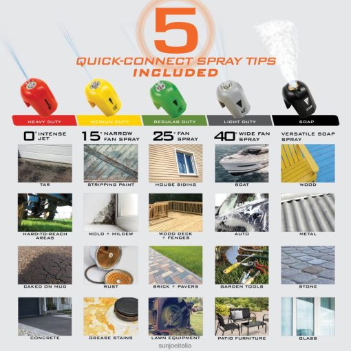 questa idropulitrice consente anche di personalizzare la pressione uscita della spray alle tue esigenze di pulizia con cinque ugelli spray a collegamento rapido (0o, 15o, 25o, 40o e sapone). intercambia gli ugelli per passare rapidamente da un getto a matita ad alta pressione da 0 gradi a uno spruzzo a ventaglio a bassa pressione da 40 gradi o applica il detergente sulla superficie da pulire con l’ugello per sapone. altre caratteristiche includono un tubo ad alta pressione da 20 piedi, un cavo di alimentazione da 35 piedi, un adattatore per tubo da giardino e un grilletto tss (sistema di arresto totale) che spegne automaticamente la pompa quando il grilletto non è attivato. Garanzia di 2 anni.